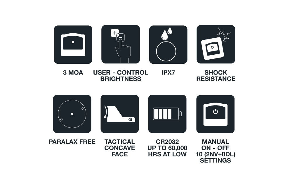 MO2, 10 seviyeli manuel parlaklık kontrolüne sahiptir; alt 2 seviyesi NVG, 8 gündüz içindir. MECANIK MO2 çok maksatlı refleks optik nişangah, Kişisel/konut savunma, avcılık ve müsabaka atışları için ideal nokta boyutu olan 3 MOA kırmızı noktaya sahiptir.